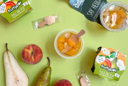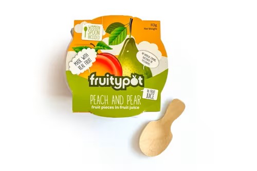 Fruitypot Peach & Pear in Juice 18x113g – A delightful mix of peach and pear pieces immersed in fruit juice, providing a delicious and convenient snack option. Each portion comes with a paper-wrapped wooden spoon, making it easy to enjoy anytime, anywhere. Ideal for a quick breakfast, a refreshing dessert, or a midday snack. This 18-pack is designed with shelf-ready packaging for straightforward ambient storage, ensuring you always have a tasty treat on hand. Perfect for busy lifestyles, school lunches, and health-conscious individuals looking for a fruity delight without any fuss.