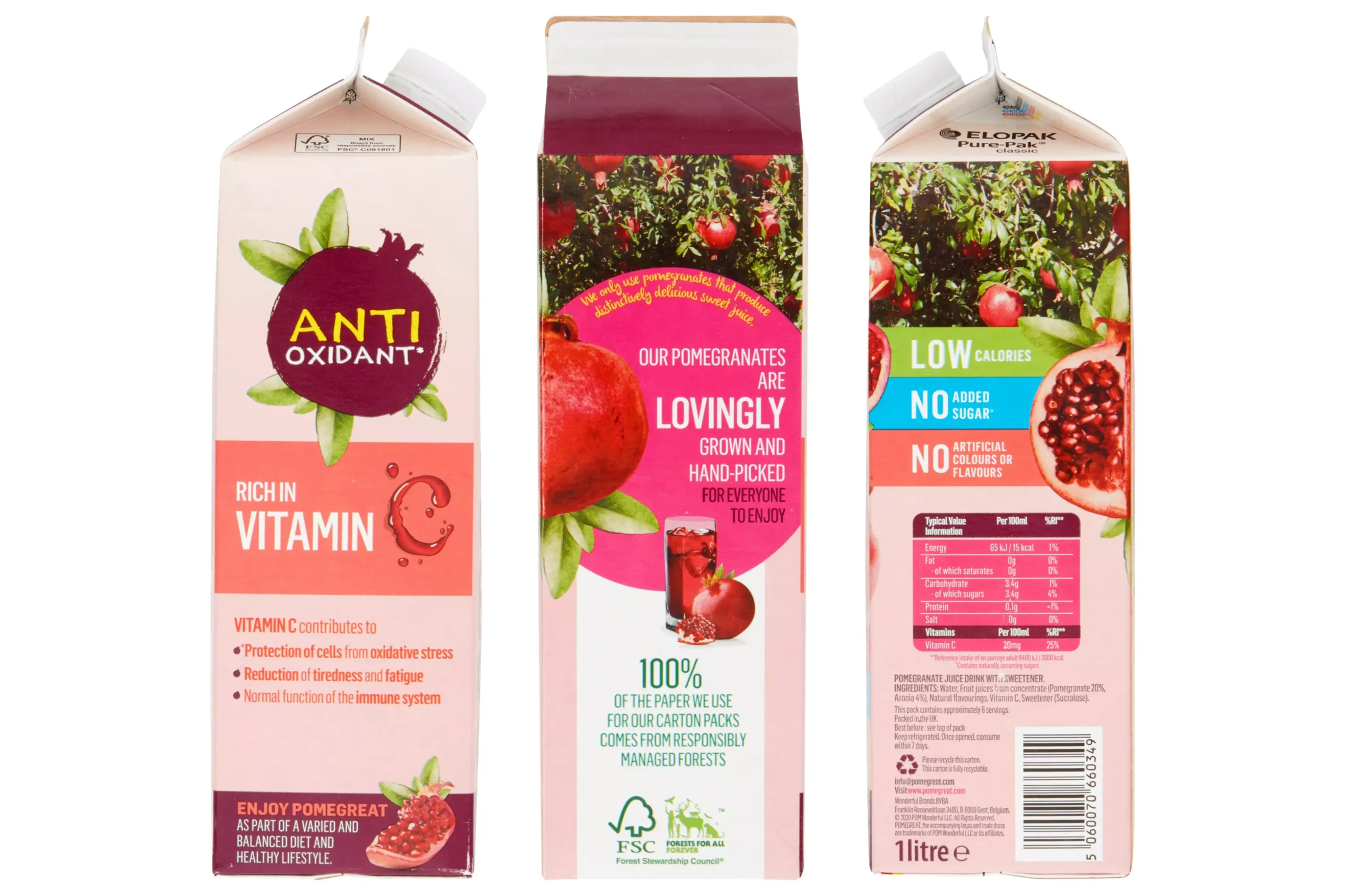Water, Fruit Juices from Concentrate (Pomegranate 20%, Aronia 4%), Natural Flavourings, Vitamin C, Sweetener (Sucralose)