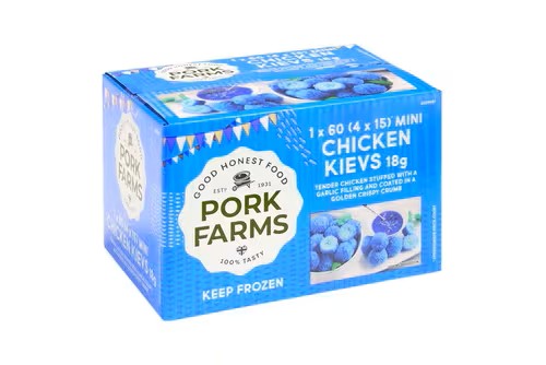 Savour the flavour of Pork Farms Mini Chicken Kievs, ideal for any gathering or casual snack. Made with carefully seasoned British chicken and filled with a luscious garlic butter sauce, these mini kievs offer a burst of taste in every bite. Coated in crunchy breadcrumbs, they’re easy to prepare and enjoy, whether you prefer them hot or cold. Pack includes 60 kievs, shipped frozen for optimal quality.