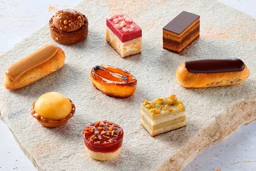 Sugar, Water, CREAM, EGGS, BUTTER, Semi-skimmed MILK, WHEAT flour, Ground ALMONDS, EGG whites, Apricots 2%, Raspberries 2%, Glucose syrup, Chocolate 2% (cocoa mass, sugar, cocoa butter, emulsifier: lecithins (SOYA)), Whole MILK, EGG yolk, Dark chocolate 1% (cocoa mass, sugar, cocoa butter, emulsifier: lecithins (SOYA)), Blackcurrant 1%, Starches, Apples 0.9%, Raspberry pieces 0.8%, Cocoa butter, Cocoa mass 0.4%, White chocolate (sugar, cocoa butter, whole MILK powder, skimmed MILK powder, emulsifier: lecithins (SOYA), natural vanilla flavouring), Chopped PISTACHIOS 0.4%, Lemon concentrate 0.3%, Gelling agents: pectins, carrageenans, sodium alginate, agar-agar, Skimmed MILK powder, Whole MILK powder, PISTACHIO puree 0.2%, Coffee extract, Low-fat cocoa powder 0.2%, Concentrated BUTTER, Chopped ALMONDS, Vegetable fat (sunflower), LACTOSE and MILK proteins, Chopped HAZELNUT 0.1%, Caramel glazing 0.1% (sugar, water), MILK fat , Natural PISTACHIO flavouring , Instant coffee 0.04%, Salt, Caramelized sugar, Natural vanilla flavouring, Acidity regulator: citric acid, Stabiliser: carrageenans, Spirulina extract, Emulsifier: lecithins (SOYA), Lemon essential oil.